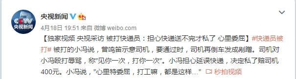 而据央视采访可知,快递小哥为了及时送快递示意黑色轿车司机挪动车辆。黑色轿车移动后,快递车在通过时曾鸣笛示意司机,而司机却无故再次倒车这才导致剐蹭事件的发生。
